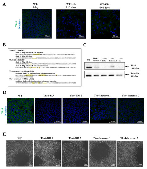 Generation of Tks4-knockout HUES9 cells. (A) Representative confocal images showing the typical immunostaining for Tks4 during spontaneous differentiation via EB formation in HUES9 cells; (B) Sequence of exon 2 of SH3PXD2b in the two newly generated homozygous-mutated (KO/KO) clones and the two heterozygous clones (WT/KO). The mutant nucleotides are labelled with yellow marker in the region of interest of the sequenced allele. Validation of Tks4 loss at the protein level in the two Tks4-KO HUES9 clones in comparison with the original HUES9 and heterozygous cells using (C) western blotting and (D) immunocytochemistry (ICC): Tks4—green, nucleus—blue (DAPI); (E) Representative bright field images showing that all of the cell lines retain human ESC morphology (scale bar 75 µm).
