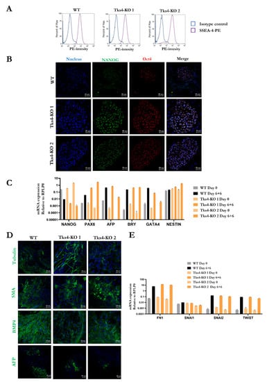 Assessment of the pluripotency of the Tks4-KO HUES9 cells. (A) The SSEA4 expression levels in WT cells and the Tks4-KO cells were analysed via flow cytometry. Isotype controls were used as a negative control on each plot; (B) Immunofluorescent staining showing the Oct4 (red) and Nanog (green) expression levels in undifferentiated cells; (C) The expression levels of the pluripotency-related genes Nanog and differentiation-related genes Pax6, alpha fetoprotein (AFP), brachyury (BRY), GATA4, and NESTIN were analysed via RT-qPCR to assess the efficiency of spontaneous differentiation. Gene expression was normalized to the value of RPLP0; (D) The differentiation potential into all the three germ layers of WT cells and the Tks4-KO cells were assessed via ICC of β-III-tubulin, smooth muscle actin (SMA), bone morphogenetic protein 4 (BMP4), and AFP after 6 + 6 days of the spontaneous differentiation. Nuclei were counterstained with DAPI (blue); (E) Expression levels of EMT-related markers (Fibronectin (mRNA:FN1), Snail1 (mRNA:SNAI1), Snail2 (mRNA:SNAI2), Twist (mRNA:TWIST)) were measured via RT-qPCR and compared to those of the original stem cell lines (day 0) within the spontaneous differentiated derivatives (day 6 + 6 of differentiation).