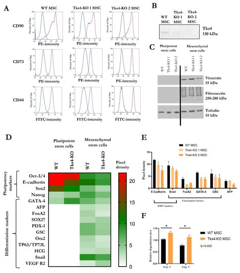 (A) Representative flow cytometry histograms showing CD90, CD72, and CD44 staining of WT (WT) MSC and the two Tks4-KO MSC clones. (Blue lines represent the isotype control labelling); (B) Representative western blot showing the presence of Tks4 in WT MSC cells and the lack of Tks4 protein in Tks4-KO MSC clones; (C) Western blot analysis of the EMT (and differentiation) markers Vimentin and Fibronectin in pluripotent stem cells (WT and Tks4-KO) and the generated MSC (WT and Tks4-KO) lines; (D) Heatmap comparing the proteome profiler stem cell array results of the pluripotent stem cells (WT and Tks4-KO) and the generated MSC (WT and Tks4-KO) lines. The two Tks4-KO clones were measured separately but the obtained data sets were combined and the averages of two independent biological samples were presented; (E) Protein levels of early differentiation markers (E-cadherin, Snail, FoxA2, GATA4, goosecoid (GSC), AFP) measured in WT and Tks4-KO MSC lines analysed separately in the two Tks4-KO MSCs; (F) Results of the gelatinase assay (repeated twice: Exp. 1 and Exp. 2) showing the degradation activity of the WT MSC line and the average of the two Tks4-KO MSC lines. The figure shows the quantitation of the relative degradation area (dark area of the FITC-gelatine surface) per cell area (TRITC-Phalloidin labelling). Student’s unpaired t-test was used for the statistical analysis. * p < 0.005.