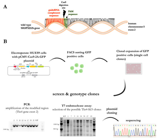 (A) A schematic overview of the mutant region of SH3PXD2b exon 2 on human chromosome 5, showing the complementary sequence of the guide RNA (gRNA), the Cas9 digestion site, and the PAM sequence; (B) Stepwise representation of the knock-out generation and clonal screening strategy for Tks4-KO HUES9 cells after genome editing. After single-cell plating of GFP+ cells, 21 clones were expanded for genomic DNA isolation and T7 endonuclease analysis. Next, 10 DNA samples from potentially mutated clones were used for amplification of the affected region of exon 2 and cloned in plasmid. Sanger sequencing confirmed the isolation of two homozygous Tks4-KO clones and two heterozygous Tks4 clones.