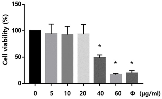 To determine an optimum non-cytotoxic dose of Dex, BV2 cells were treated with various concentrations of Dex (0, 5, 10, 20, 40, 60 μg/mL) for 24 h before exposing them to LPS and ATP, and the cell viability was analyzed using the MTT assay. The subsequent experiments were performed 20 μg/mL of Dex because at 40 μg/mL or more of Dex showed severe cell toxicity (Figure 5).