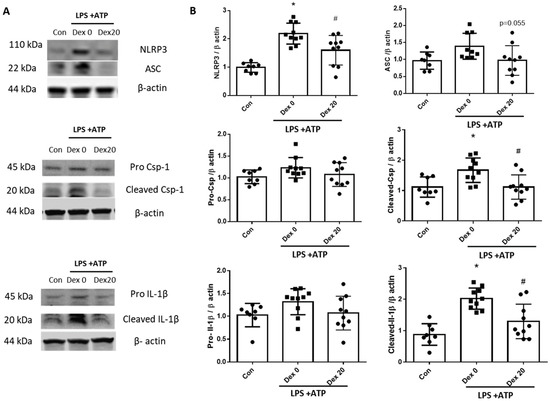 Figure 6. Downregulation of NLRP3 inflammasome complex by Dex treatment (n = 8~10 per group). (A) Western blot analysis of NLRP3, ASC, Caspase-1, and IL-1β in BV2 cell lysate, (B) quantitative data showing protein expressions, *, p < 0.05 compared to the con; #, p < 0.05 compared to the Dex 0.