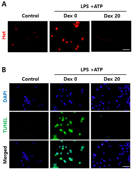To analyze the effect of oxidative stress and cell death, PC12 cells were exposed to the CM from BV2 for 16 and 24 h, respectively. In LPS + ATP induced cells without Dex pretreatment (Dex0), oxidative stress (red signal; oxidized Het) was markedly increased compared to the control group (Figure 7A). The number of TUNEL-positive cells were also significantly increased in the Dex0 group compared to the control (Figure 7B). However, excessive ROS and the number of TUNEL-positive cells decreased markedly in the Dex treated group (Figure 7). These results suggest that Dex protects the cells against oxidative stress-related damage.