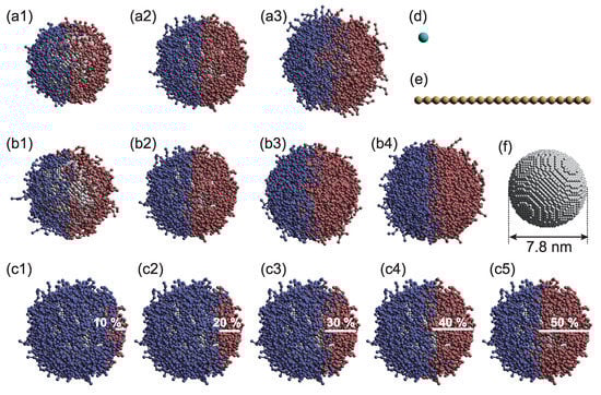 Specific results will now be discussed in detail. The degree of influence of on depended on L. For example, at the lowest investigated L value (3), changed slightly for . However, at high L (L = 9), decreased as increased across its entire range. Figure 4a–c show representative snapshots of PTNPs at equilibrium, acquired at , %, and different lengths. For L = 3, only the hydrophobic polymers close to their nanoparticle surfaces formed a contact layer, whereas for L = 9, all hydrophobic polymers formed a cylindrical contact layer. Thus, because of the variation in the contact layer with L, the dependence of on also varied with L.