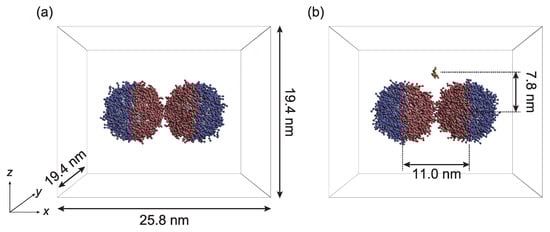 In the initial configuration of the simulation system (Figure 2), the PTNPs were initially fixed, and periodic boundary conditions were applied in all directions. All the simulations were performed in a constant-volume and constant-temperature ensemble. The volume of the simulation box was 25.8 × 19.4 × 19.4 nm, and the simulations were conducted at room temperature (1.0 ).
