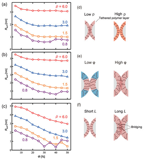 Distance between PTNP surfaces () with respect to the coverage ratio and tethered polymer length L: (a) L = 3, (b) L = 6, and (c) L = 9. Schematics illustrating the differences in according to (d) , (e) of a hydrophobic tether, and (f) L.