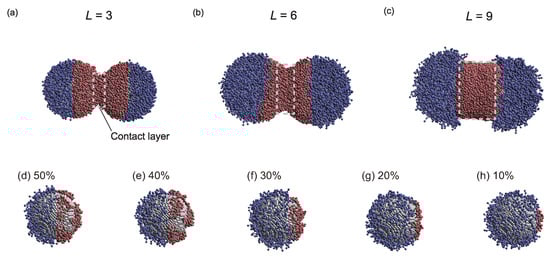 Interestingly, trends different from those of the other configurations were observed at low graft densities (Figure 3a–c). In particular, for = 0.8, increased at high coverage ratios ( 35–50%), whereas it decreased with for the other values. Figure 4d–h show snapshots of PTNPs with the left side at equilibrium for different values. At high coverage ratios (%, Figure 4d,e), the hydrophobic polymers formed multiple aggregated domains on the nanoparticle surface. These domains caused local stacking upon contact with the other PTNP, which led to an increase in . This local stacking is likely difficult to control, particularly because irregular variations in were observed for 30% at L = 9.