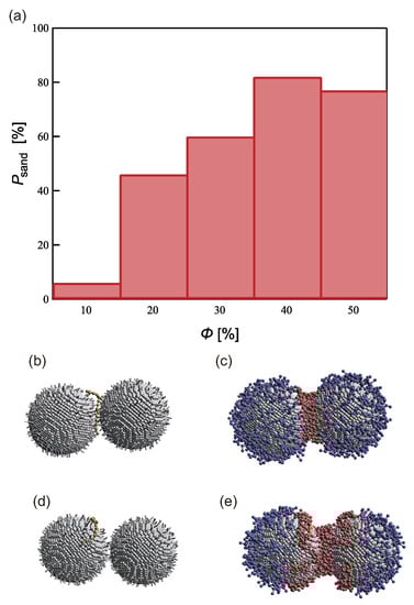 However, the corresponding to = 50%, which has the widest hydrophobic region, was lower than that corresponding to = 40%. This is due to the capture of the target molecule beyond the measurement area, as shown in Figure 5d,e. As mentioned above, when is low and is high, the hydrophobic polymer forms multiple aggregated domains and becomes trapped in one of them. This inappropriate trapping is more likely to occur when is high; this was confirmed in the simulations conducted with 40%. was found to increase as increased; however, the probability that the target molecule was trapped on only one side of the NP surfaces increased. Therefore, and had a trade-off relationship.