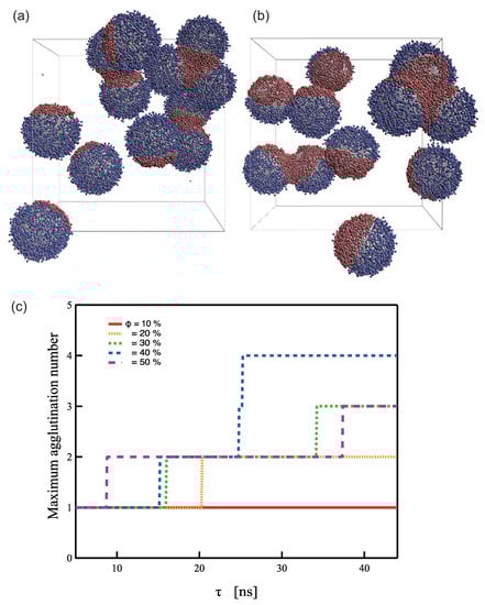 Representative snapshots of PTNPs in equilibrium at = (a) 30% (b) 50% and (c) Maximum agglutination number at each coverage ratio.