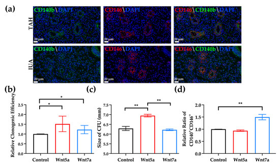 Our cell experiment shows that recombinant Wnt5a and Wnt7a both promoted the proliferation of the CD140b+CD146+ population. However, Wnt5a could enlarge the size of the CFUs without preserving the expression of the double marker. This indicates that as the stem cells proliferate, more cells lose their phenotype upon the stimulation of Wnt5a. This finding supports our hypothesis that hyper-activation of Wnt signaling contributes to the pathogenesis of IUA. Thus, it is interesting to investigate whether Wnt5a may lead to differentiation towards a specific lineage. Besides, the link between Wnt activation and endometrial fibrosis also remains to be confirmed.
