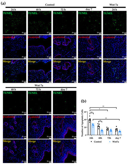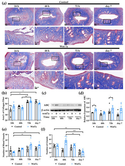 Without Wnt7a, the number of glands at day 7 was significantly lower than 24 h. A similar trend was noticed for the Wnt7a injected side. This is consistent with the trend of the formation of the fibrosis, when significant amount of collagen fibers starts to form after 72 h. However, Wnt7a significantly increased the number of glands at 48 h. This suggests that activation of Wnt signaling helped endometrial restoration within a relatively short period after the injury. The follow-up formation of the fibrosis and reduction of the glands may be due to the exhaustion of Wnt7a or hyper-activation of the fibrinogen aggregation. This remains to be investigated. We also found that the intrauterine injection of Wnt7a significantly reduced the apoptosis of the cells, especially at 24 and 48 h. More interestingly, we seldom saw any co-localization of TUNEL and ABC in the sections during the quantification. This further supports that activation of Wnt signaling is implicated in tissue repair at the early stage after the endometrial damage. Unfortunately, without surface markers, it is almost impossible to isolate stem cells from rat uteri. Therefore, it is difficult to verify the effect of Wnt7a on endometrial stem cells in the murine models.