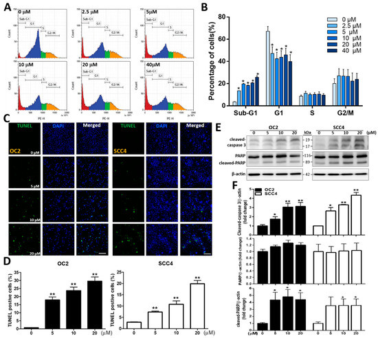 Figure 2. Stellettin B-induced cell cycle arrest and apoptosis in human OSCC cells. (A) Analysis of cell cycle distribution of OC2 cells treated with stellettin B was assisted with propidium iodide (PI) staining-based flow cytometry. The cells were exposed to 0, 2.5, 5, 10, 20, and 40 µM stellettin B for 24 h. The peaks in the flowcharts indicate the cell cycle phases of sub-G1, G1, S, and G2/M. (B) Histograms displaying the proportion of each phase of the cell cycle under the indicated stellettin B concentration in OC2 cells. (C) OC2 and SCC4 cells were exposed to 0, 5, 10, and 20 µM stellettin B for 48 h and then stained with TUNEL dye (emitting green fluorescence) and 4,6-diamidino-2-phenylindole (DAPI) (showing blue fluorescence). The cells were placed under a fluorescence microscope for observation. Scale bar = 100 μm. (D) Quantified levels of TUNEL positive cells. (E) Western blot analysis of the expression of the apoptosis-related protein, cleaved caspase 3, PARP, and cleaved PARP, in OC2 and SCC4 cells treated with 0, 5, 10, and 20 µM stellettin B for 48 h. (F) Quantified levels of cleaved caspase 3, PARP, and cleaved PARP by comparing with β-actin. Original, uncropped images of the Western blots are displayed in Supplementary Figure S1A. β-actin was blotted as an internal control, and error bars stand for the mean ± SE. The data are shown for a minimum of three independent trials in triplicate analyzed using Student’s t-test to determine significance; * p < 0.05 and ** p < 0.01 relative to the control (untreated cells).
