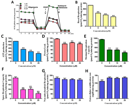 Figure 3. Stellettin B-induced down-regulation of mitochondrial respiration in OC2 cells at 0, 5, 10, 20 μM. (A) Measurement of OCRs and time (min) curve. (B) Analysis of basal respiration. (C) Analysis of ATP production. (D) Analysis of proton leak. (E) Analysis of maximal respiration capacity. (F) Analysis of spare respiration capacity. (G) Analysis of non-mitochondrial respiration. (H) Analysis of extracellular acidification rate. The data are shown for a minimum of three independent trials in triplicate analyzed using Student’s t-test to determine significance; ** p < 0.01 relative to the stellettin B untreated groups.