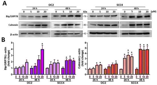 Figure 4. The effects of stellettin B on the levels of ER stress-related protein biomarkers calnexin and BiP/GRP78. OC2 and SCC4 cells were exposed to 0–20 µM stellettin B for 24 and 48 h. (A) Western blot analysis of the expression of ER stress proteins BiP/GRP78 and calnexin. (B) Quantified levels of BiP/GRP78 and calnexin. Original, uncropped Western blots images are displayed in Supplementary Figure S2. β-actin was used as an internal control. The data are shown for a minimum of three independent trials in triplicate analyzed using Student’s t-test to determine significance; * p < 0.05 relative to the stellettin B untreated groups.