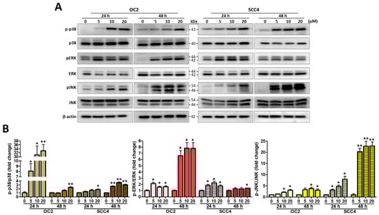 Figure 5. Stellettin B regulated MAPK signaling. (A) Western blotting for p38, p-p38, ERK, pERK, JNK, and pJNK levels in OC2 and SCC4 cells treated with 0–20 µM stellettin B for 24 and 48 h. (B) Quantification of the MAPKs. Original, uncropped Western blot images are displayed in Supplementary Figure S3. β-actin was blotted as an internal control, and error bars stand for the mean ± SE. The data are shown for a minimum of three independent trials in triplicate analyzed using Student’s t-test to determine significance; * p < 0.05 and ** p < 0.01 relative to the control (untreated cells).