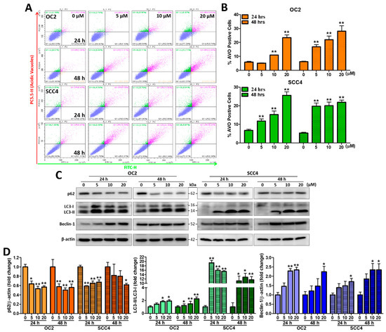 Figure 6. The effects of stellettin B on autophagy-related AVOs and autophagy proteins p62, LC3-I/II, and Beclin-1. (A) The fluorescence intensity of AO measured for detecting autophagy at 0–20 µM stellettin B for 24 and 48 h using a Beckman CytoFLEX flow cytometer. (B) Quantified levels of AVO-positive cells after exposure to 0–20 µM stellettin B for 24 and 48 h were analyzed using Beckman CytoExpert flow analysis software (v.2.5., Indianapolis, IN, USA). (C) OC2 and SCC4 cells were exposed to 0-20 µM stellettin B for 24 and 48 h. Western blot analysis was performed with the use of antibodies against autophagy-related proteins LC3, p62, Beclin-1, and β-actin. (D) Quantified levels of the proteins in Figure 3C. Original, uncropped images of the Western blots are displayed in Supplementary Figure S1B. β-actin was used as an internal control, and error bars stand for the mean ± SE. The data are shown for a minimum of three independent trials in triplicate analyzed using Student’s t-test to determine significance; * p < 0.05 and ** p < 0.01 relative to the control (untreated cells).