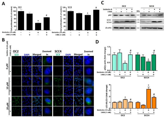 Figure 7. The rescue effects of the autophagy inhibitor, 3-MA, on stellettin B-induced cell viability and autophagic proteins. (A) OC2 and SCC4 cells were pre-exposed to 1 mM 3-MA prior to exposure to 10 µM stellettin B for 48 h. Cell viability was determined using MTT-based assay. (B) Autophagy was evaluated by conducting immunofluorescence staining of LC3 proteins (showing green signal), while the nuclei were labeled with DAPI (showing blue signal). Scale bar = 50 μm. On the merged images, the white squared areas are enlarged and placed on the right shown as zoomed-in. (C) Western blotting for autophagy-related proteins p62 and LC3-I/II in OC2 and SCC4 cells after 48 h treatment. (D) Quantified levels of p62 and LC3-I/II. Original, uncropped Western blot images are displayed in Supplementary Figure S4, and error bars stand for the mean ± SE. The data are shown for a minimum of three independent trials in triplicate analyzed using Student’s t-test to determine significance; * p < 0.05 and # p < 0.05 relative to the 3-MA untreated and stellettin B untreated groups, respectively.