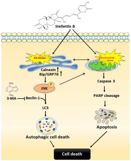 Overall, this study demonstrated that stellettin B induces apoptosis and autophagy by affecting the ER stress and mitochondrial stress and activating MAPK signaling, which shows potential to be further developed for use in cancer.