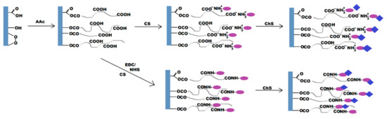 Plasma post-irradiation grafting of acrylic acid (AAc) onto the polylactic acid (PLA) surface followed by immobilization of chitosan (CS) through either direct or carbodiimide coupling and chondroitin sulfate (ChS) molecules immobilization.
