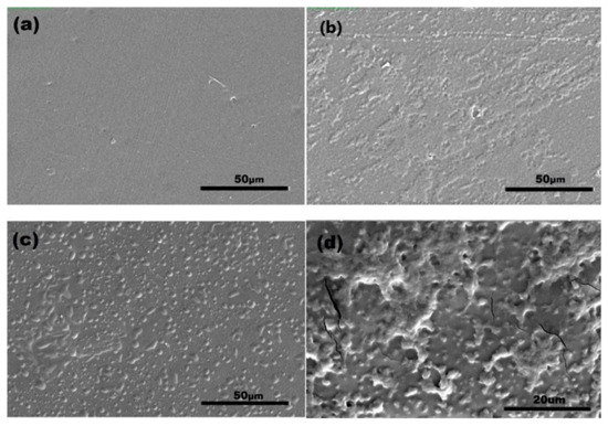 SEM measurements were carried out to confirm the surface functionalization of the PLA film surfaces. The SEM image of the neat PLA film (Figure 2a) clearly shows that the surface was homogenous and smooth after the compression molding process. It could be seen in Figure 2b that the RF plasma treatment caused rough and micro-crack formations on the PLA surface. That behavior is attributed to the oxidation and etching/ablation properties of the topmost layers of polymers during low-pressure plasma treatment and has been observed in other studies as well [43,44].