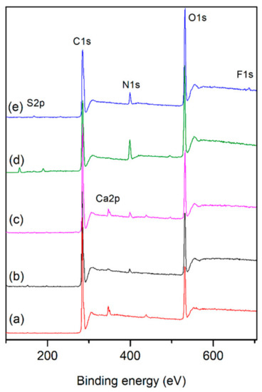 XPS spectra of (a) untreated PLA, (b) CS, (c) g-CS, (d) g-CS-ChS, (e) g-CS-ChS-L.