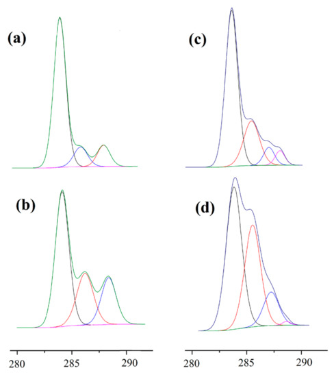 XPS C1s spectra of (a) untreated PLA, (b) RF, (c) g-CS, (d) g-CS-ChS.