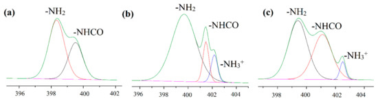 Figure 5a–c show the N1s core-level spectra, and two peaks occurred in Figure 5a indicating that the plasma treated sample contained two nitrogen regions with binding energies of 399.46 and 398.28 eV which corresponded to N-H and C-N, respectively due to the nitrogen content of the plasma processing gas (air) [54]. With CS coating, a new peak appeared at 402.18 eV, which was attributed to the protonated amine of the polysaccharide. Compared with CS coating, the protonated amine decreased whereas the amide bond slightly increased in CS-ChS coating because of the electrostatic interaction between the two saccharides and amide groups in the ChS structure.