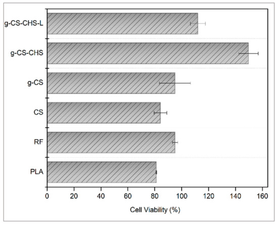 The highest biocompatibility was observed with the samples of ChS immobilization on CS-grafted polymer surface by electrostatic adsorption. This phenomenon could be ascribed to the masking effect of positive charge on CS with the negatively charged sulfate groups of ChS [31,75]. Cytotoxicity test results were consistent with the hydrophilicity degree of the samples. The most hydrophilic samples had the highest % cell viability. As reported in the literature, while proteins can maintain their conformations on hydrophilic surfaces, hydrophobicity causes protein denaturation [76]. As a whole, the obtained results in this study, indicate that ChS- and CS-coated PLA films do not cause toxicity in the cells and are highly suitable materials for biomedical applications. Moreover, in the literature, it was stated that the lomefloxacin is slightly cytotoxic to cells [77,78]. As can be seen in the drug-loaded CS-ChS coated films, even though the cell viability dropped by almost 40%, due to the high biocompatibility feature of these saccharides’ combination biocompatibility was observed at around 100%. The data implied that this combination has the potential to reduce the cytotoxicity of certain drugs.