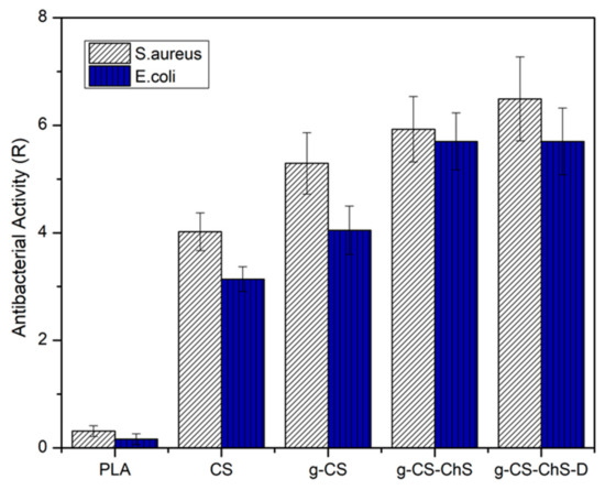 The antibacterial efficacy of the neat PLA and modified films was evaluated against Staphylococcus aureus and Escherichia coli strains and analyzed by calculating the antibacterial activity value (R). According to JIS Z 2801 standard, the samples are considered to have antibacterial activity with the value of R equal or superior to two. As can be seen in Figure 7, untreated PLA did not possess antibacterial activity against both the bacteria strains. The bactericidal activity of PEC-coated PLA films (g-CS-ChS) against both the Gram-positive and the Gram-negative bacteria strains was higher than the CS-coated ones. The antibacterial property of ChS has been reported in previous studies [79,80]. The improved antibacterial activity with CS-ChS PEC compared to CS alone may be due to an additive effect of both ChS and CS interaction. In our previous study, it has been shown that ChS possesses significant bacteria killing property for both the Gram-positive and negative bacteria and is more effective on E. coli than S. aureus [34]. In the present study, while CS coated samples expressed more than 1.5-fold higher antibacterial activity on S. aureus than E. coli, PEC-coated PLA films showed almost equally high bacteria killing property against the both of the bacteria strains and increased overall efficiency, which shows the contribution of ChS coating. The exact antibacterial mechanisms of these polysaccharides are still unclear and for explaining the mechanism of antibacterial activity of CS, different hypothesis have been proposed in the literature. It has been reported by other authors that CS is unable to penetrate the bacterial cell wall and shows its bacteria killing property by acting as a chelating agent and selectively binding to the trace metals that are crucial for stability of the bacteria cell wall [81,82]. Thereby a possible mechanism for ChS enhancing the activity of CS may be by a cooperative interaction between both compounds, which act together on the bacterial membrane by possessing opposite charges and effecting the membrane integrity. One of the explanations for the possible mechanism of antibacterial activity of sulfated polysaccharides, such as ChS, fucoidan, and dextran, is trapping nutrients, for example, cationic minerals, by negatively charged groups in their structure, and resulting in a decrease in the bioavailability of nutrients for microorganisms [83,84,85]. In another study, Sharma et al. investigated the antibacterial properties of ChS and CS scaffolds and found that when they were combined, the formed PEC showed an additive killing effect on the bacteria species [31]. However, further studies are needed to clarify the action mechanisms of these polysaccharides against microbial growth.
