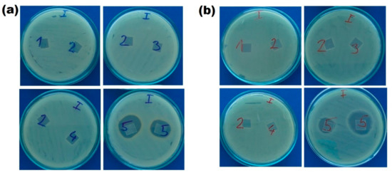 Possible bacteria killing mechanism of modified PLA films was examined by the zone of inhibition test. As shown in Figure 8, the samples without drug loading were lack of inhibition zones and only lomefloxacin-loaded samples (no.5) showed the bacterial inhibition zone for both of the bacteria strains. The inhibition zones for S. aureus and E. coli were 5.33 ± 0.94 and 6.67 ± 1.25 mm, respectively. The different zone of inhibitions of the samples no.5 could be due to the inhomogeneous drug loading during complex formation between CS and ChS. In terms of the surrounding clear zone around drug-loaded CS-ChS coated samples, our results have revealed that these samples show a dual mechanism with contact killing through CS-ChS molecules and release killing by leaching of lomefloxacin from the CS-ChS coated surface. It is stated in the literature that CS does not diffuse on the agar gel [91], and our study supports this statement as no inhibition was found beyond the limits of CS-coated PLA films. These experiments also showed that the zone of inhibition tests alone may not be enough to prove antibacterial efficiency of the materials as the agar dilution methods indicated bactericidal activity for CS and CS-ChS coated films, in the zone of inhibition tests antibacterial activity was not observed due to the lack of a clear zone around the samples. Only drug-loaded films showed a clear inhibition zone around the specimens, which indicates a diffusion-related killing mechanism. An antibiotic drug was used as a model drug to demonstrate the contact killing mechanism of polysaccharides coating.
