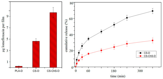To test the drug loading and release properties of the coating, lomefloxacin is used as a model drug and the results are presented in Figure 9. It can be seen, that the amount of lomefloxacin loading is highest for the PEC-coated PLA films (g-CS-ChS). The amount of drug adhering to the CS-coated samples doubled after CS-ChS coating. The results were in line with the literature that shows the PEC formation between polysaccharides increases the drug loading efficiency [92]. The drug loading study showed that direct loading onto plasma treated PLA samples resulted in insufficient drug amount on the surface. On the other hand, polysaccharides coating facilitated higher drug adherence.