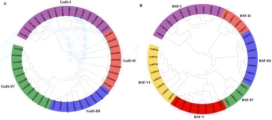 Raffinose, the smallest member of RFOs, is widely found in the leaves, roots, seeds and tubers of plants, for instance, Arabidopsis thaliana [], Brassica napus [], Nicotiana tabacum [], Zea mays [], Cicer arietinum [], Gossypium hirsutum [], Sesamum indicum [] and so on. As two significant oligosaccharides in the raffinose family, raffinose and galactinol play a vital role in responding to abiotic and biotic stresses in the plant []. Galactitol and raffinose synthase enzymes are critical for raffinose synthesis []. To date, there were a few reports regarding GolS and RFS genes in horticultural crops, such as cucumber [], peas [], apple [], banana [], tea [] and grapevine []. Kiwifruit is an important horticultural crop with enriching in vitamin C []. Here, we identified 22 GolS and 24 RFS genes from the genome sequence of A. chinensis variety ‘Hongyang’ and A. eriantha variety ‘White’. As shown in Figure 1A, phylogenetic analysis showed that 21 GolS genes were classified into four subgroups (Figure 1A), which is consistent with that previously reported in other species, such as cotton [], tomato [], tobacco [], and sesame []. As shown in Figure 1B, phylogenetic analysis showed that 24 RFS genes were classified into six subgroups, consistent with cotton []. A similar exon/intron structure with 1 to 5 and conserved motifs of most RFS gene members shared in the same group was found in kiwifruit, which was also supported by phylogenetic relationships (Figure 2B). In short, these results showed that RFS gene family in kiwifruit might be relatively conservative during evolution.