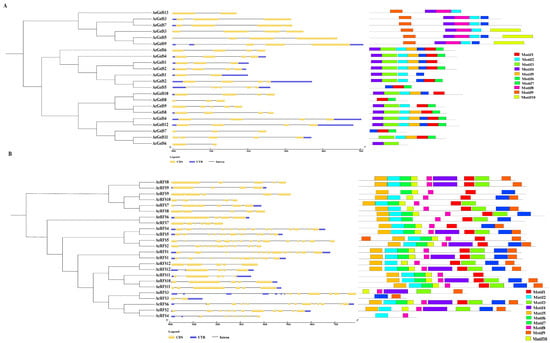 Conserved motifs and exon-intron organization of GolS and RFS genes in two kiwifruit species. (A) Neighbour-joining phylogenetic tree, gene structures, and conserved motifs of the GolS genes in A. chinensis and A. eriantha. (B) Neighbour-joining phylogenetic tree, gene structures, and conserved motifs of the RFS genes in A. chinensis and A. eriantha.
