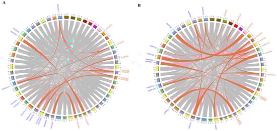 Gene duplication analysis of the kiwifruit GolS and RFS genes. (A) Pink lines connect the syntenic regions between the kiwifruit GolS genes. (B) Pink lines connect the syntenic regions between the kiwifruit RFS genes.