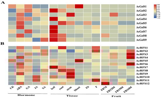 AcRFS8/9/10 exhibited specific high expression in stem (Figure 4B). AcRFS3/4/12 exhibited relatively low expression levels in all tissue (Figure 4B). AcRFS1/2/11 were strongly expressed in the flower. Only AcGolS9 was strongly expressed under salicylic acid treatments (Figure 4B). Among AcRFS genes, only AcRFS5 had a high expression in the shoot (Figure 4B). Six AcRFS genes (except AcRFS1/3/5) were highly expressed in the leaf (Figure 4B). Five AcRFS genes (AcRFS2/3/4/6/12) were expressed during the fruit development (Figure 4B). More than 60% of the AcRFS genes were significantly induced in response to ABA treatments (Figure 4B). Moreover, AcRFS10 and AcRFS11 were significantly up-regulated in response to JA treatments (Figure 4B).