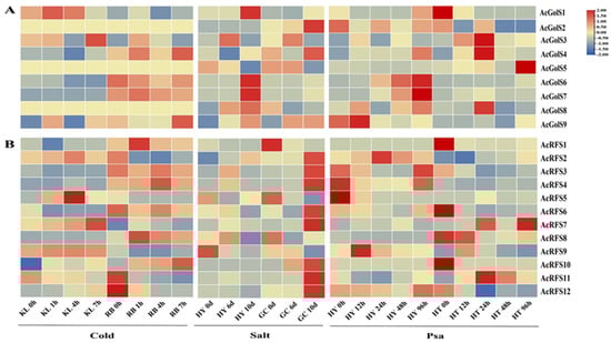 Expression analysis of AcGolS and AcRFS genes under cold, salt, and Psa. (A) Expression profiles of AcGolS genes; (B) Expression profiles of AcRFS genes. To the figures’ right, the color bar represents the log2 FPKM (fragments per kilobase of exon per million reads mapped) value.