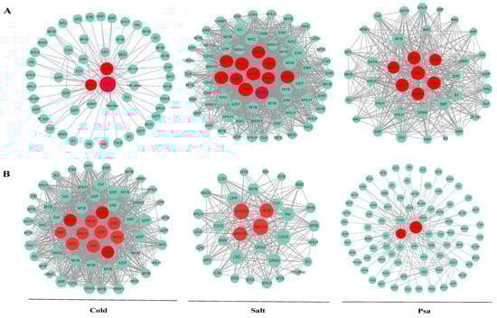 Co-expression network hub transcription factors targeting key AcRFS and AcGolS genes were analyzed by using the ‘cor’ function of the R package with Pearson’s correlation coefficients (r ≥ 0.9 or r ≤ −0.9 and p-values ≤ 0.05) under cold, salt and Psa stresses conditions. Cytoscape 3.4.0 software (http://www.cytoscape.org/ (accessed on 30 August 2021)) was used to visually describe co-expression network results []. The degree >N50 was used to identify the genes of hub transcription factors.