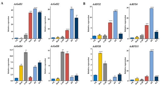 Expression levels of key AcGolS and AcRFS genes under abiotic stresses (heat, cold, salt, drought, waterlogging) by quantitative real-time RT-PCR. (A) Expression levels of AcGloS1/2/4/8. (B) Expression levels of AcRFS2/4/8/11. Three biological and technical replicates calculated the error bars. Asterisks indicated the corresponding gene significantly up or down-regulated under the different treatments using t-test (* p < 0.05, ** p < 0.01, *** p < 0.001, **** p < 0.0001; one-way ANOVA test by Tukey’s test). Ns indicated the corresponding gene no significantly up or down-regulated under the different treatments using t-test.