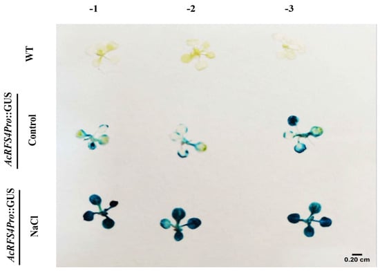 To further investigate salt-induced AcRFS4 expression, the 2000 bp promoter sequence of AcRFS4 was fused to the β-glucuronidase (GUS) coding region and transformed into wild-type Arabidopsis (WT). Analysis of three independent transgenic plants (AcRFS4Pro::GUS-1, -2, and -3) revealed that salt treatment strongly induced GUS expression in the transgenic lines relative to controls (Figure 8). This finding indicated that the transcription of AcRFS4 was enhanced by salt stress.