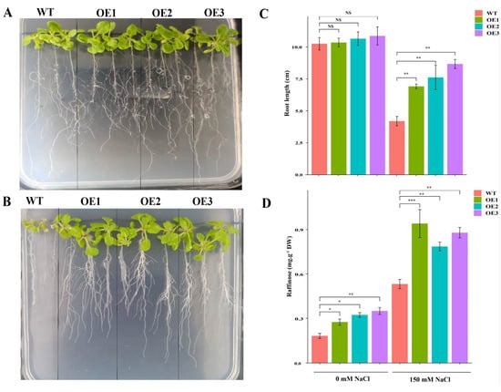 Overexpression of AcRFS4 results in enhanced salt tolerance. (A) Observation of the root length of wild type (WT) and T3 AcRFS4-transgenic Arabidopsis seedlings (OE1, OE2 and OE3) under 0 mM NaCl. (B) Observation of the root length of wild type (WT) and T3 AcRFS4-transgenic Arabidopsis seedlings (OE1, OE2 and OE3) under 150 mM NaCl. (C) Measurement of the root length of wild type (WT) and T3 AcRFS4-transgenic Arabidopsis seedlings (OE1, OE2 and OE3) under different concentrations of NaCl. (D) Raffinose content of wild type (WT) and T3 AcRFS4-transgenic Arabidopsis seedlings (OE1, OE2 and OE3) under different concentrations of NaCl. Three biological replicates and technical replicates calculated the error bars. Asterisk indicates significant difference compared to WT (* p < 0.05, ** p < 0.01, *** p < 0.001; one-way ANOVA test by Tukey’s test). NS indicates no significant difference compared to WT.