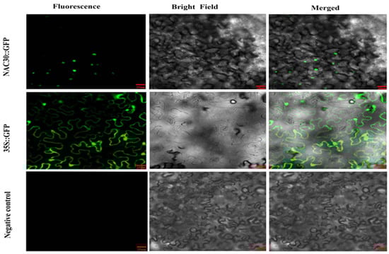 The transient expression of 35S::GFP plasmid showed that GFP fluorescence was observed throughout the cells, while the green fluorescence signals of the 35S::AcNAC30-GFP plasmid were specifically found in the nucleus (Figure 10). This result indicated that AcNAC30 might encode a nuclear-localized protein, which was consistent with its functional characteristics in regulating gene transcription.