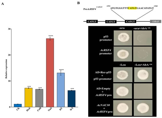 The transcript level of AcNAC30 was significantly up-regulated upon salt application (Figure 11A). Compared with control, the transcript level of AcNAC30 was nearly 25 times higher after salt treatment (Figure 11A). Promoter self-activation of Y1H Gold showed that ≥150 ng mL−1 aureobasidin A (AbA) inhibited the growth of Y1H Gold containing the pABAi-AcRFS4-Pro recombinant plasmid (Figure 11B). Only the positive control strain and transformed Y1H Gold harboring both pABAi-AcRFS4-Pro and pGADT7-AcNAC30 could grow in a medium without leucine (-Leu) (150 ng mL−1 AbA), validating protein-DNA interaction of AcNAC30 and the AcRFS4 promoter (Figure 11B).