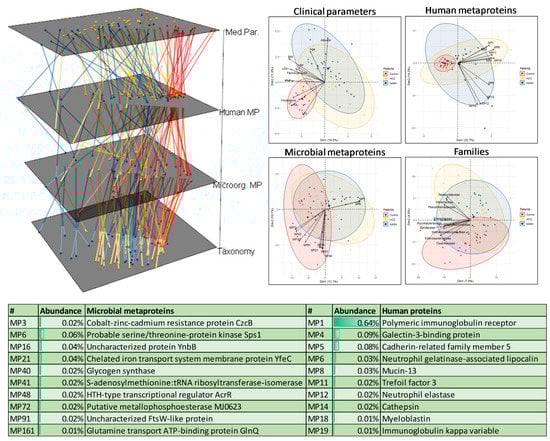 Figure 1. Multilayer PCA of clinical parameters, human and metaproteins, and family-level taxonomy for all samples. The individual PCAs were visualized on the left, and same samples were connected across all layers. The associated biplots with the top 10 loadings were shown on the right side. For human and microbial metaproteins, the metaproteins with at least 0.01% of the total spectral count were selected. In contrast, for families and clinical parameters, all 419 and 30 were chosen, respectively. For better readability, the top ten human and microbial loadings (metaproteins) were summarized in a table below the plot.