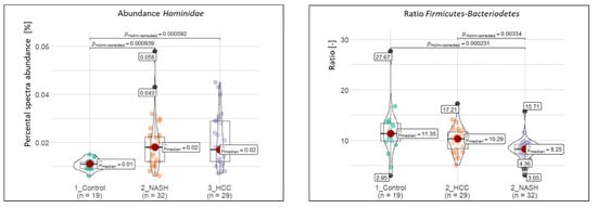 In contrast to these three disease-specific biomarkers, increased abundance of the family Hominidae combined with more metaproteins derived from the immune system (e.g., calprotectin from neutrophilic granulocytes) and the gut barrier reflected a worsened health status of NASH and HCC patients in contrast to the healthy control. However, this is not specific to NASH or HCC. For example, Lehmann et al. [15] observed higher abundances of calprotectin (protein S100-A9) in the feces of patients with inflammatory bowel disease, and Biemann et al. (2021) [16] showed that obese patients possess a systemic inflammation, higher abundances of protein S100-A9, and increased abundance of the family Thermotogaceae.