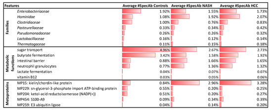 Among others, we observed in NASH and HCC patients more proteins assigned to Hominidae (spectral abundance (#SpecAb)_C: 1.08%, #SpecAb_NASH: 1.92%, #SpecAb_HCC: 2.07%) (Figure 2) and Thermotogaceae (#SpecAb_C: 0.11%, #SpecAb_NASH: 0.15%, #SpecAb_HCC: 0.18%; Figure 3), and less assigned to Enterobacteriaceae (#SpecAb_C: 1.92%, #SpecAb_NASH: 1.55%, #SpecAb_HCC: 1.73%), Clostridiaceae (#SpecAb_C: 1.00%, #SpecAb_NASH: 0.76%, #SpecAb_HCC: 0.83%), and Lactobacillaceae (#SpecAb_C: 0.16%, #SpecAb_NASH: 0.12%, #SpecAb_HCC: 0.14%) (Figure 3).