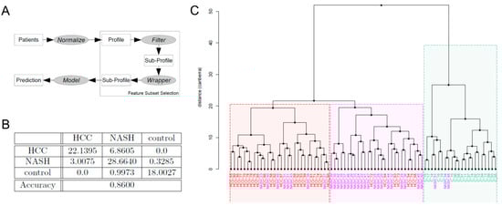 Figure 4. Machine learning-based sample classification between NASH, HCC, and controls. (A) shows the workflow of the software for feature selection, feature wrapping, and development of the classification algorithms. (B) shows display of the confusion matrix of the best-observed classifier (linear discriminant analysis.). Cross-validation ensured that the patient numbers in the confusion matrix were real and not natural numbers. The evaluation was performed by averaging a 5-fold cross-validation on 10,000 repeats. (C) shows the clustering of the data and their intrinsic similarity using Ward linkage and Canberra distances.