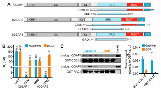 Different domains and fragments of the IQGAPs, including GRD1 and C794 of IQGAP1, as well as GRD2 and C795 of IQGAP2 (Figure 1A), were purified to determine their binding affinities for mGDP- and mGppNHp-bound CDC42 using fluorescence polarization. Obtained dissociation constants (Kd; Figure 1B) clearly show that all IQGAP constructs are able to bind CDC42 but with different affinities and preferences for the nucleotide-bound forms of CDC42. GRDs of both IQGAPs are low-affinity binders and do not discriminate between the active and the inactive states of CDC42. Similar observations were made for GRD3 and the CT of IQGAP1 (Supplementary Figure S1). In contrast, C794 and C795, encompassing in addition to both GRD and CT also the central RGCT (Figure 1A), exhibited Kd values of 0.6 and 0.9 µM, respectively, indicating an around 100-fold higher affinity for the GTP-bound active CDC42 as compared to CDC42 GDP (Figure 1B). This result clearly suggests that RGCT but not GRD represents a ‘CDC42-specific GBD’ for at least IQGAP1 and IQGAP2, by directly associating with the switch regions of CDC42 GTP. Unfortunately, our efforts to obtain IQGAP1 RGCT (aa 1276–1575) and IQGAP3 C790 (aa 841–1631) for determining their binding affinities to the members of the RHO GTPase family, including CDC42, has been remaining unsuccessful [26,51]. Purified IQGAP1 RGCT tends to assemble into higher oligomeric or polymeric states, and, thus, is disabled in binding CDC42 [51].