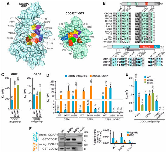 We first determined the Kd values for the GRD1 and GRD2 interaction with the mGppNHp-bound CDC42 WT, 2xSW and 8xSW. Interestingly, we found a two to three-fold reduction in the binding affinity of GRD1 but no notable reduction for GRD2 with the CDC42 variants as compared to CDC42 WT (Figure 1B, Figure 2C and Figure S3). As the effect of 2x and 8x introduced mutations on the proposed crucial interaction sites of CDC42 and GRD2 did not result in a decrease of affinity, our data clearly indicates that the association of CDC42 switch regions with IQGAP must be through other sites rather than the GRD.