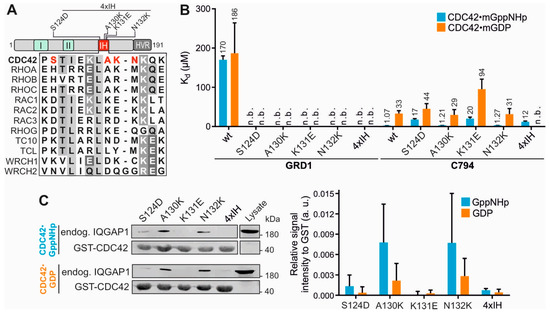 Several published studies have shown that mutations of the CDC42 IH impact their properties in binding IQGAPs. Li et al. (1999) have shown that IH deletion in CDC42 impairs its binding affinity for the effectors, in particular IQGAP1 C794 [53]. Owen et al. (2008) investigated the impact of the IH mutations in CDC42Q61L on IQGAP1 C794 binding [56]. Consistent with our findings, they observed a slight decrease in C794 affinity for CDC42Q61L with A130K or N132K. Moreover, Ozdemir et al. also applied the CDC42Q61L variant and suggested the IH together with switch I region to be mainly responsible for its binding to the ex-domain of GRD (GRDex) of IQGAP2 [54].