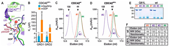 Comparative analysis of IQGAP1 GRD1 interaction with CDC42Q61L and CDC42wt. (A) Structural overlay of CDC42wt GDP AlF3 p50GAP (green; PDB: 1GRN) on CDC42Q61L GTP IQGAP2 (blue; PDB: 5CJP) with the focus on Q61 hydrogen bonds (red dashed lines). GDP AlF3 mimics the transition state of the GTP hydrolysis reaction and is coordinated with the magnesium ion (Mg2+) and the nucleophilic water molecule (w) and the arginine finger (R282) of p50GAP. Aluminum trifluoride (AlF3) mimics the γ-phosphate of GTP in the transition state. In contrast to L61, Q61 is critical for the catalysis of the GTP hydrolysis reaction through three hydrogen bonds (see text). (B) Fluorescence polarization data of IQGAP GRD1 with CDC42 mGppNHp and CDC42 mGDP. (C–F) IQGAP GRD differently forms complexes with CDC42WT and CDC42Q61L, respectively, when applied on an analytical SEC. For this purpose, CDC42WT GppNHp (C) or CDC42Q61L GppNHp (D) were mixed with IQGAP1 GRD1 and SEC was performed on a Superdex 200 10/300 column using an ÄKTA purifier (flow rate of 0.5 mL/min, fraction volume of 0.5 mL) and a buffer, containing 30 mM Tris/HCl, pH 7.5, 150 mM NaCl, and 5 mM MgCl2. The elution profiles represented one peak for the respective CDC42 proteins (#1), two peaks for the respective mixtures of respective CDC42 proteins with GRD (#2 and #3) and one peak for the GRD1 (#4). (E) Coomassie brilliant blue staining of the corresponding elution volumes indicated that only peaks #2 contain GRD1 complexes with CDC42WT or CDC42Q61L, respectively. Peaks #3 only contain the CDC42 proteins as compared to the peaks #1 and #4. (F) The SEC profiles of CDC42WT and CDC42Q61L are summarized for each peak regarding the elution volume, the molecular weight (MW) and the stoichiometry. M stands for monomeric and D for dimeric. The theoretical MWs of CDC42 (21.2 kDa) and GRD (43 kDa) were calculated using the Expasy Protparam tool. The presented MWs for each peak was calculated based on the calibration curve (aldolase 158 kDa and ovalbumin 44 kDa, respectively) and partition coefficient plot (Kav = Ve − V0/Vc − V0) versus the logarithm of MWs; Ve: elution volume number; V0: void volume (8 mL); Vc: geometric column volume (24 mL)). Accordingly, peaks #2 correspond to a heterotetrameric complex between CDC42WT GppNHp and GRD1 with a MW of 130 kDa, and a heterotrimeric complex of GRD and CDC42Q61L GppNHp with a MW of 85 kDa.